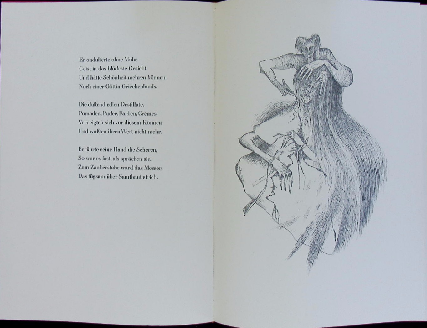 LÖRINCZ.– BEARDSLEY, Aubrey: Die Ballade vom Barbier. = The ballad of a barber. D.v. Horst Ziermann. Frankfurt a.M. (Wolter Editionen), 1966. 4°. 12 Bl. mit 6 Zeichnungen von Peter Lörincz. OLn in OSchuber. tadellos. Nr. 230 von 300 eigenhändig vom Künstler signierten Ex. der EA.