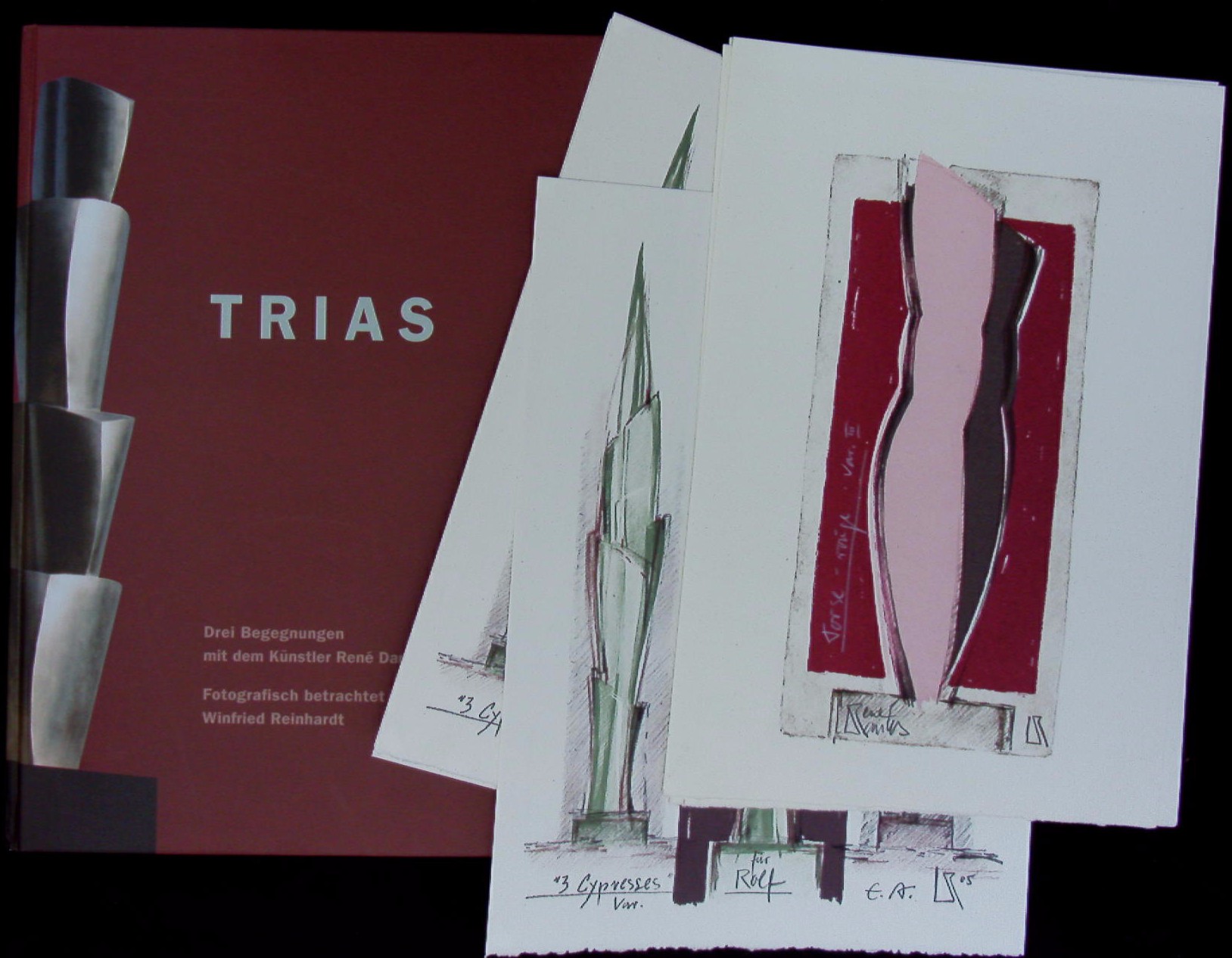 DANTES.– BAUMBUSCH, Claudia: Trias. Drei Begegnungen mit dem Künstler René Dantes. Fotografisch betrachtet von Winfried Reinhardt. Pforzheim (Penn-Club 2000), 2005. 4°. 95 S. mit zahlr. farb. Bildtafeln. ill. OPb. 1 von 1500 Ex. der EA mit einer eigenhändigen Widmung des Künstlers auf Titelseite. Inliegend 8 (d.i. 2 x 4) eigenhändig signierte, datierte und monogrammierte Farbholzschnitte von René Dantes auf stärkerem Karton.