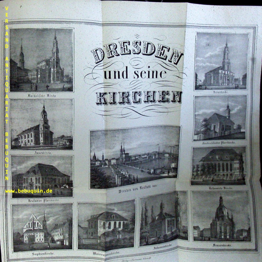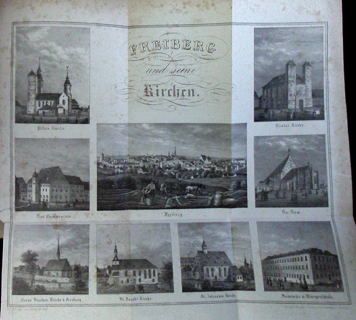 SACHSEN.– SACHSENS KIRCHEN – GALERIE (Kirchengalerie).– Erster und zweiter Band. Die Inspectionen: Dresden, Meissen und St. Afra / Die Inspection Freiberg. 70 Lieferungen und 1 Supplement-Lieferung (alles). 2 Bände in 1 Bd. Dresden (Herrmann Schmidt), 1837/38. 4°. VIII, 152 S., 2 Bl., S. 153 – 280 + 132 (von 136) ganzseitigen lithografische Bildtafeln von Kirchen und Dorfansichten sowie drei mehrfach gefalteten Prämienblättern von Dresden, Meißen und Freiberg. späteres HLdr auf 6 Bünden mit goldgeprägtem Rückenschild. Anfangs wenige Unterstreichungen, nur vereinzelt stockfleckig, es fehlen die 4 Ansichten von Freiberg, ebenda sind 2 fehlende Tafeln ergänzt und aufgezogen, eine Lieferung ist verbunden. Insgesamt von guter Erhaltung. Ein Werk, das über die Historie der jeweiligen Ortschaften unter besonderer Berücksichtigung der klerikalen Belange und der damals aktuellen Situation informierte. Es dauerte über zwei Generationen, bis zu Beginn des 20. Jahrhunderts die „Neue Sächsische Kirchengalerie“ erschien, die – zwar wesentlich umfangreicher und gründlicher- ein visuelles Hilfsmittel nicht mehr einsetzte: Die Lithografie. Die „alte“ Galerie aber verfügt über zahlreiche Steindrucke der jeweiligen Kirchen, bei größeren Städten auch vieler Profanbauten, die nach Federzeichnungen von G. Täubert entstanden (Steindrucker Renner bzw. Ketzschau). Diese kleinen Kunstwerke geben nicht nur sehr detailgetreu die Architektur und Zustände der betreffenden Bauwerke wieder, der Künstler bemühte sich, diese in ihrer gesamten Umgebung wirken zu lassen und vergaß auch nicht, die Stilleben durch Menschen und Tiere zu beleben. Hier mit der großen Zahl von Lithographien von: Lockwitz, Leubnitz, Possendorf, Priessnitz, Reichstädt, Reichstadt, Kesselsdorf, Hosterwitz, Grumbach, Pillnitz, Weistropp, Pesterwitz, Saxdorf, Dippoldiswalde, Constappel, Seifersdorf, Coswig, Döhlen, Ruppendorf, Leuben, Plauen, Tharand, Wilsdruff, Höckendorf, Loschwitz, Förder-Gersdorf, Unckersdorf, Somsdorf, Kötzschenbroda, Rabenau, Kaditz, Kreischa, Dresden, Taubenheim, Köln, Limbach, Sora, Zehren, Tannenberg, Brockwitz, Burkertswalde, Heunitz, Lommatzsch, Plankenstein, Helbigsdorf, Rüsseina, Zscheila, Weinböhla, Rothschönberg, Leuben, Deutschenbroda, Röhrsdorf, Naustadt, Miltitz, Krögis, Hirschfeld, Zadel, Niederau, Oberau, Gröbern, Gross-Dobitz, Wendischbora, Neukirchen, Boritz, Ziegenhain, Planitz, Rausslitz, Polenz (jeweils teils mehrfach), Lichtenberg, Weigmannsdorf, Colmnitz, Naundorf, Ober-Schöna, Linda, Wegefarth, Cuttendorf, Ober Bobritzsch, Weissenborn, Hilbersdorf, Dorfhain, Oederan, Kirchbach, Grillenburg, Klingenberg, Pretzschendorf, Reichenbach, Bräunsdorf Eppendorf, Frankenstein, Gahlenz, Gränitz, Groß-Schirma, Krummenhennersdorf, Langenau, Zethau etc. und drei große aufklappbare Ansichten mit verschiedenen Motiven von Dresden, Meissen und Freiberg. EA. Bemmann-Jatzwauk 1/2, 385.