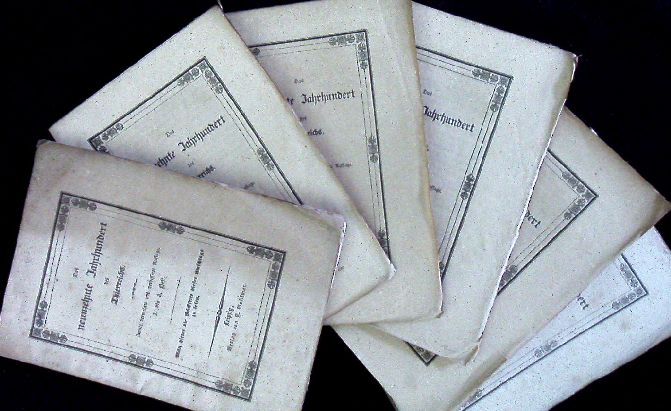 GRANDVILLE.– BUTZIGER, Gustav: Das neunzehnte Jahrhundert des Thierreichs. 2. vermehrte und verbesserte Aufl. 9 von 10 Bänden. Leipzig (Volckmar), (1843). VIII, 288 (von 317) S. mit ca 65 (von 81) lithographischen Tafeln von Ptzschke nach Grandville. Bd. 1 – 8 mit OKart. Bd. 9 ohne Einband. teils gebräunt und stockfleckig, es fehlt Heft 10. Kosch Erg-Bd. II, 554; Rümann das illst. Buch im 19 Jhdt. S. 158, 352,