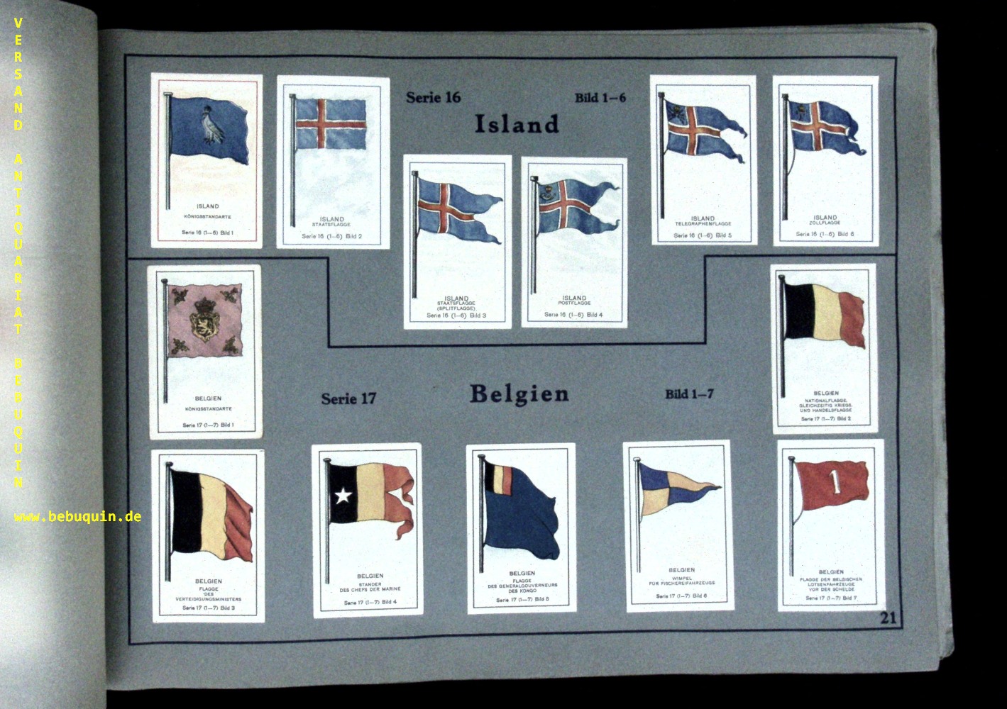 SAMMELBILDERALBEN.– MASSARY.– Wer nennt die Länder – kennt die Fahnen? Berlin (Massary Zigarettenfabrik), 1929. Quer 4°. 64 Serien mit 824 farb. Sammelbildern. ill. OKart. mit Kordeklbindung. gutes Ex. Köbereich 21318.2.
