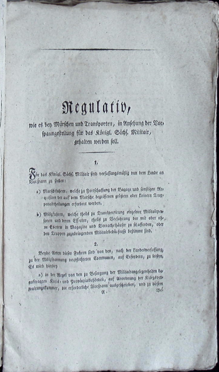 EDIKTE.– FRIEDRICH AUGUST I. (1. KÖNIG VON SACHSEN): Mandat zur Bekanntmachung des Regulativs, wie es bey Märschen und Transporten für das Königlich Sächsische Militär gehalten werden soll. Unterzeichnet am 9. Oktober 1816 von Gottlob Adolf Ernst Nostitz und Jänckendorf. Dresden, 1816. Gr. 4°. 28 S. Kanten leicht bestoßen. Seltenes Dokument für die Marschordnung mit diversen Tabellenübersichten.