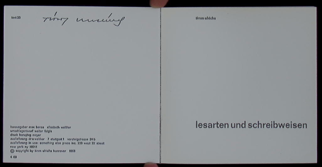ULRICHS, Timm: lesarten und schreibweisen. Hrsg. von Max Bense. Stuttgart (Walther), 1968. kl. 8. 13 Bl. OHLn. kleiner Eckbug. = rot., text 33. 1 vion 500 Ex. dieses Klassikers der konkreten Poesie mit der eigenhändigen Signatur des Autors am Druckvermerk.