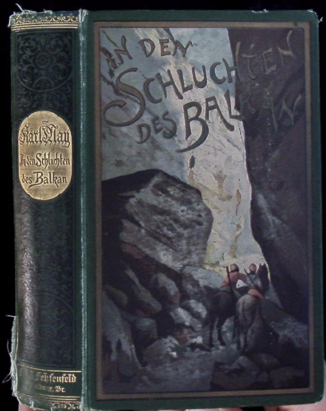 MAY, Karl: In den Schluchten des Balkan. Reiseerlebnisse. 26.– 30. Tsd. Freiburg (Fehsenfeld), (1899). 607 S. farb. ill. OLn. Plaul 44. leicht schief gelesen, Rückkante ca 5 cm angeplatzt, sonst gut mit strahlendem Rücken. = Gesammelte Reiseromane, Bd. IV. Frühe Buch-Ausgabe Plaul 232.5.