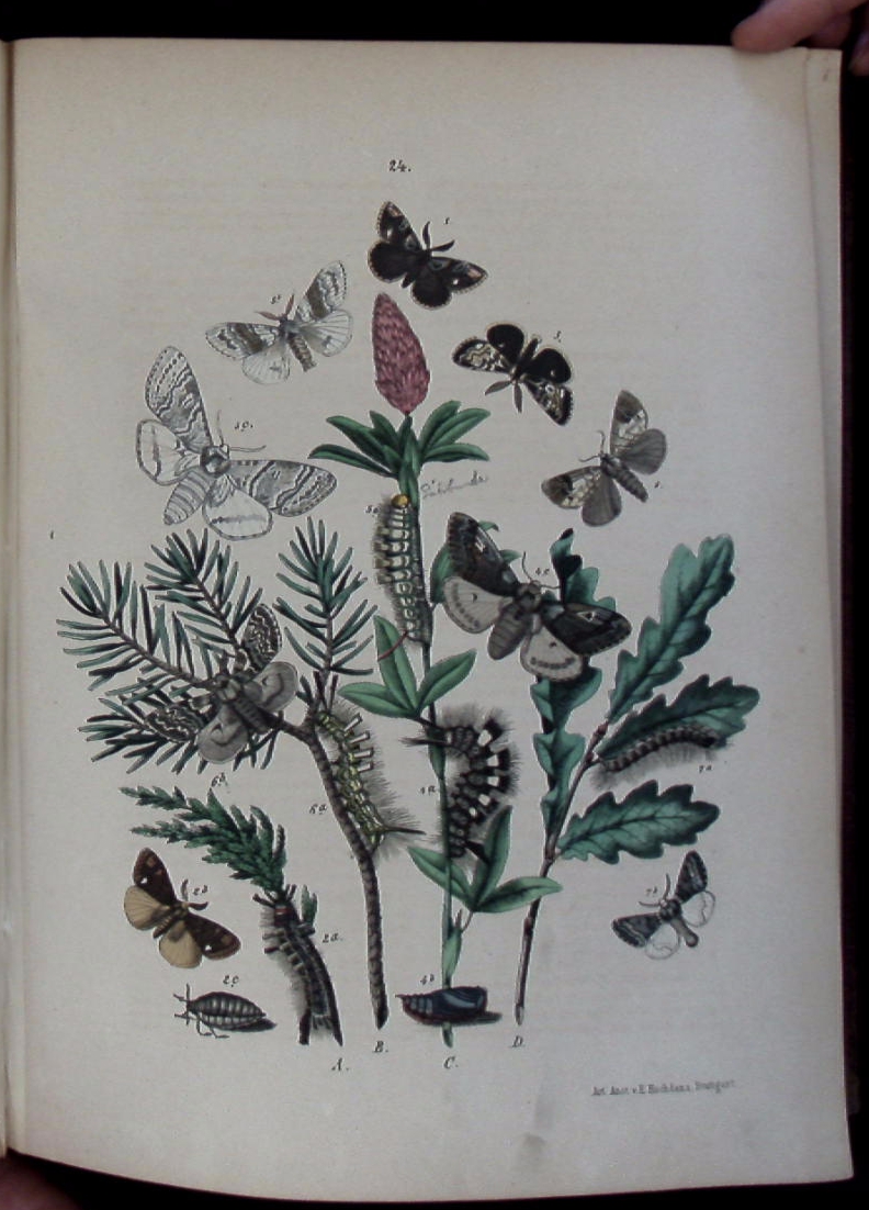 SCHMETTERLINGE.– BERGE, Fr.: Schmetterlings-Buch. 4. Aufl., gänzlich umgearb. und vermehrt von H.v. Heinemann. Stuttgart (Thienemann), 1870. 4°. 290 S. + 50 colorierte Tafeln mit 900 Abb. OLn mit motivischer Höhung. alter Rücken neu aufgesetzt, Ecken kaum bestoßen, innen kaum fingerspurig. „Bei der erforderlich gewordenen neuen Auflage des vorliegenden Buches ist eine Erweiterung desselben in der Weise eingetreten, dass die meisten Großschmetterlinge Mittel-Europa s, namentlich die in Deutschland und der Schweiz aufgefundenen sämmtlich, darin aufgenommen sind . Der Text ist vollkommen neu bearbeitet. In der Einleitung ist ausser dem Allgemeinen über den Bau der Raupen, Puppen und Schmetterlinge, die Naturgeschichte derselben, ferner der Erläuterung der wissenschaftlichen Benennungen (Terminologie) u.s.w. eine ausführliche Anleitung zum Fange und zur Zucht der Schmetterlinge, sowie die Behandlung derselben für die Sammlung und zur Einrichtung einer solchen gegeben.“ (Vorwort).