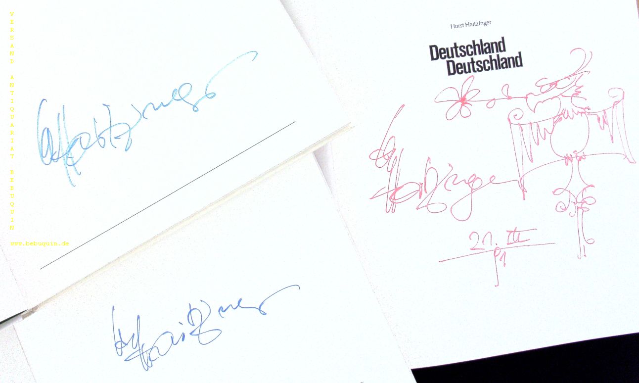 HAITZINGER, Horst: 3 Widmungsexemplare. 1. Deutschland Deutschland. 2. Bonnoptikum. 3. Bonzen-Album. 3 Bände. München (Bruckmann), 1983 ff. zusammen ca 300 S. mit zahlr. farb. Bildtafeln. farb. ill. OKart. gute Ex. Zumeist in EA jeweils mit eigenhändiger Signatur des Verfassers auf Vortitel. Nr. 1 mit einer ganzseitigen datierten Zeichnung mit Reichsadler. Zusammen für
