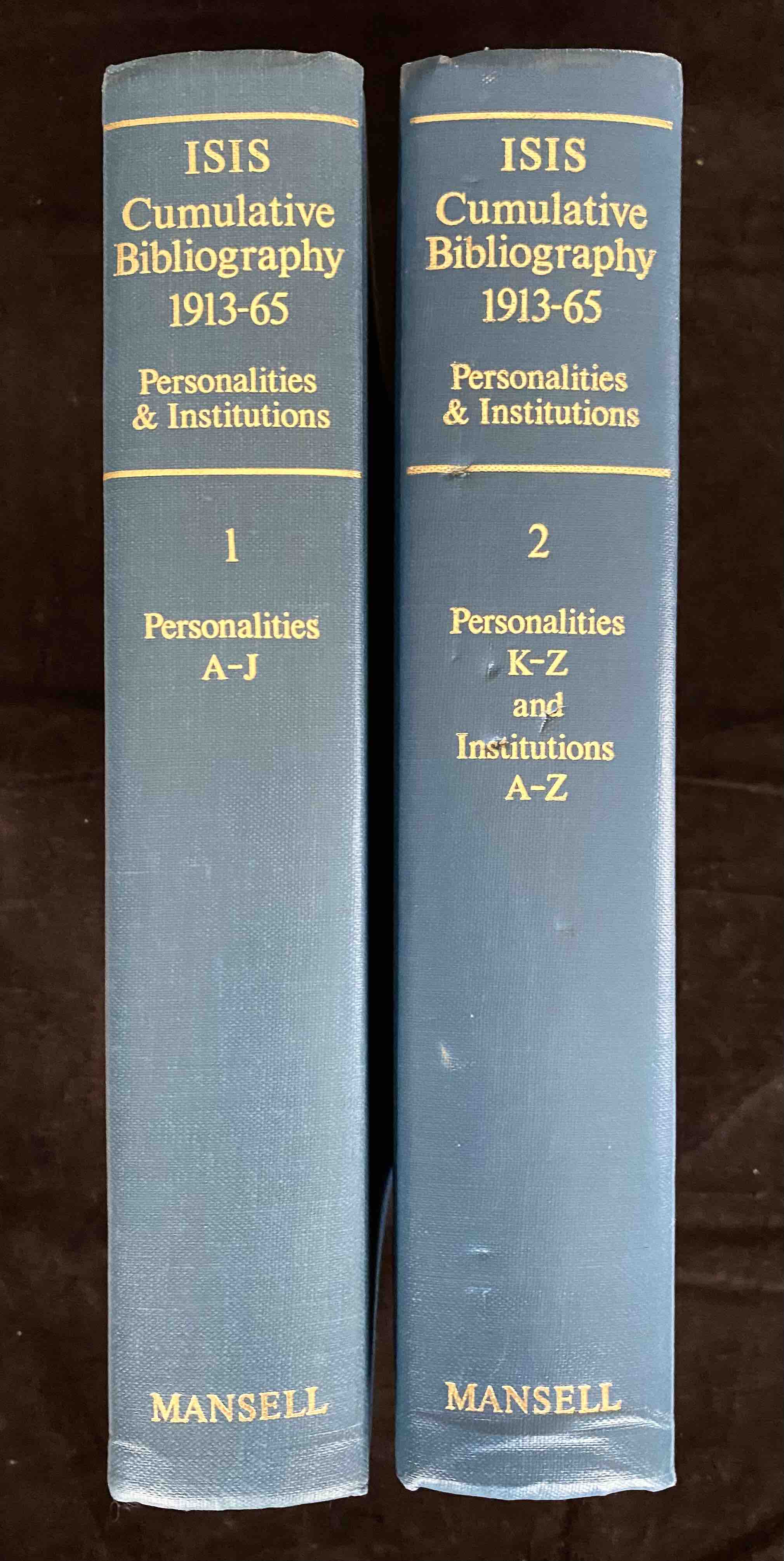 WISSENSCHAFT.– WHITROW, Magda + COHEN, Bernard I.; ISIS cumulative bibliography. A bibliography of the history of science formed from ISIS critical bibliographies 1 – 90, 1913 – 65. 2 Bände. London (Mansell), 1971. 4°. LXVIII, 664, 789 S. OLn. mit goldgeprägten Rücken. gutes Ex. EA.