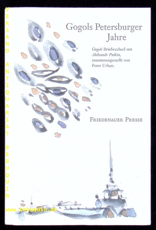 Pressendrucke.– URBAN, Peter: (Hrsg.) Gogols Petersburger Jahre. Gogols Briefwechsel mit Puskin. Eine Geschichte in Briefen. Berlin (Friedenauer Presse), 2003. 94 S. ill. OKart von Horst Husssel. tadellos. = Wolffs Broschuren. 1. Aufl. dieser Ausgabe.