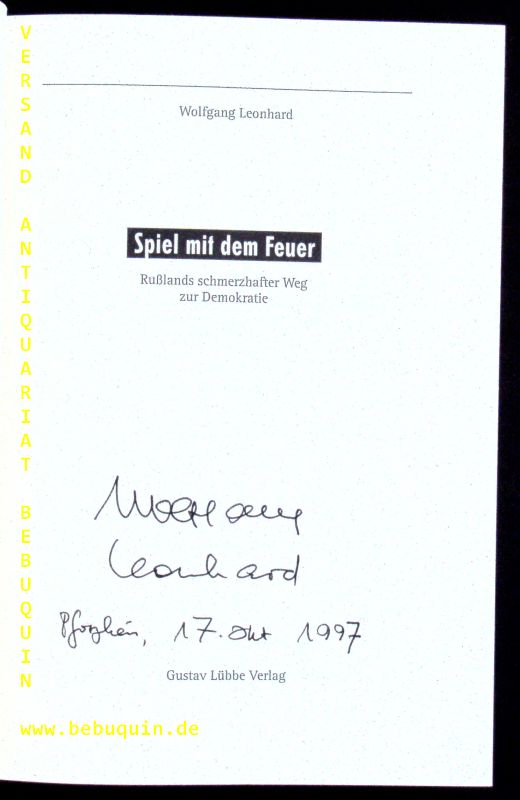 LEONHARD, Wolfgang: Spiel mit dem Feuer. Russlands schmerzhafter Weg zur Demokratie. Bergisch Gladbach (Lübbe), 1996. Gr. 8°. 333 S. mit zahlr. Abb. OPb mit OUmschl. Mit der eigenhändig datierten Verfassersignatur auf Titelseite.