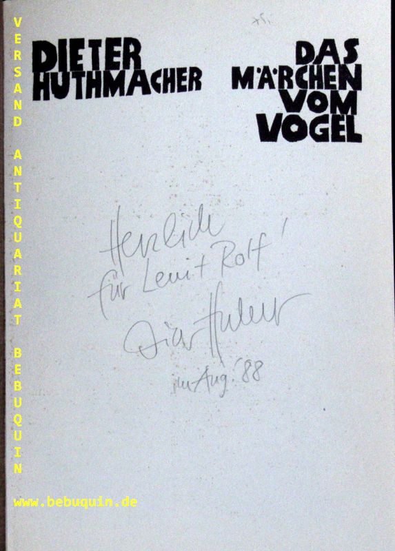 HUTHMACHER, Dieter: Das Märchen vom Vogel. Bad Teinach (Doppelfant), 1988. 4°. 67 Bl. mit ebenso vielen Bildtafeln im Holzschnitt. OPb mit ill. OUmschl. tadellos. 1 von 350 Ex. der einzigen Ausgabe mit einer persönlichen eigenhändigen datierten Widmung des Künstlers auf Vortitel.