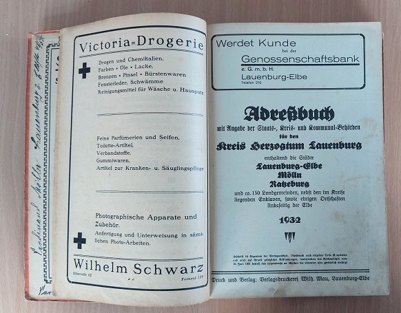 LAUENBURG.– ADRESSBUCH FÜR DEN KREIS HERZOGTUM LAUENBURG 1932.– Mit Angabe der Staats-, Kreis- und Kommunal-Behörden, enthaltend die Städte Lauenburg-Elbe, Mölln, Ratzeburg und ca. 150 Landgemeinden, nebst den im Kreise liegenden Enklaven, sowie einigen Ortschaften linksseitig der Elbe. Lauenburg- Elbe (Mau), 1932. Gr. 8°. 10, 294 (4) S. + zahlr. Werbeseiten. OHLn. Einband etwas bekratzt, innen teils braunfleckig. sehr seltenes Adressbuch.