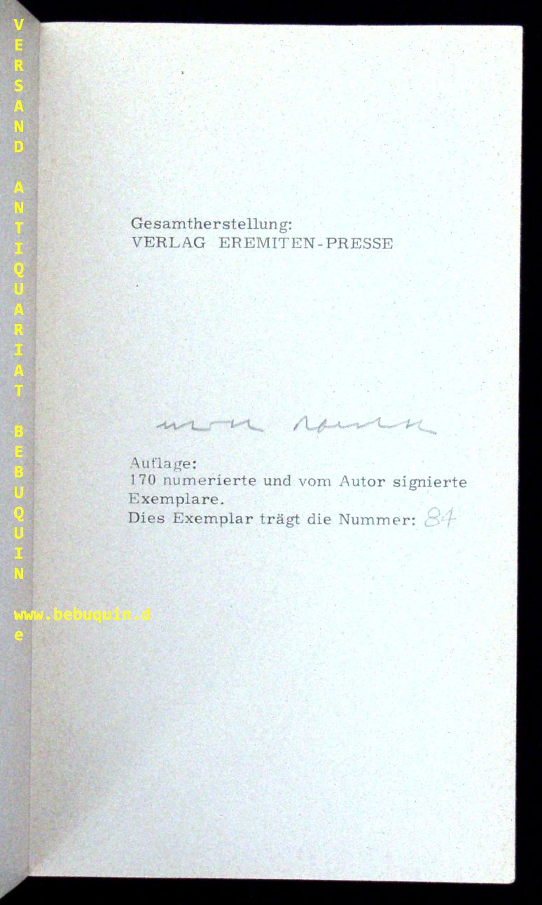 EREMITEN-PRESSE.– RASCHKE, Ulrich: Karneval. Stierstadt im Taunus (Eremiten-Presse), 1967. 40 S. mit 7 Originalgrafiken von Manfred Garstka. OKart. tadellos. Nr. 84 von 170 numerierten und vom Autor signierten Ex. der EA.