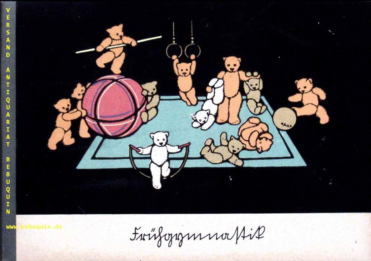 NEUGEBAUER, Marianne: Meine lieben, lieben Teddys. Das bunte Buch einer lustigen Bärenfamilie. Leipzig (Heling), ca 1947. Quer 4°. 8 Bl. unzerbrechliche Pappe mit farb. Bildern und Sütterlinschrift. farb. ill. OHLn mit leinenverstärkten Gelenken. sehr gut erhalten. sehr seltene Großvariante des gesuchten Bärenbuchs. (Mück 4208)