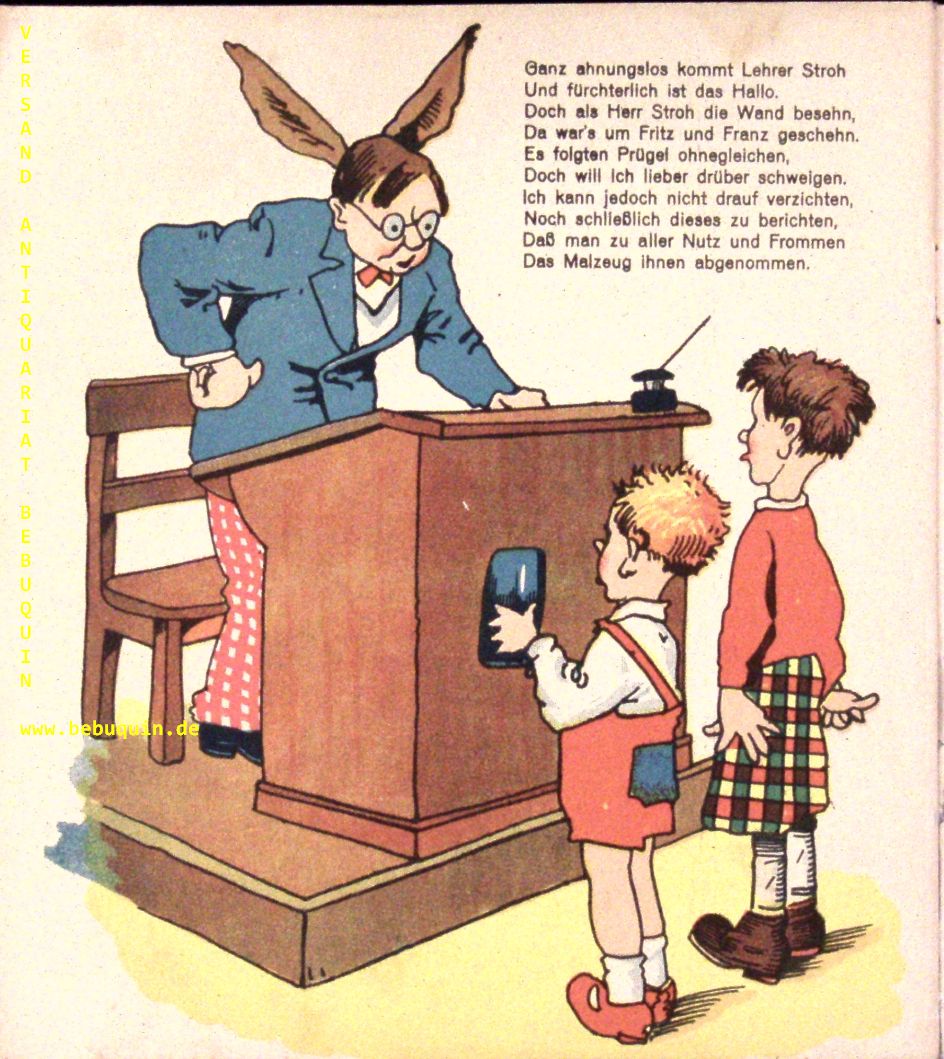 STRUWWELPETER.– DENNER, Arthur: (Hier als Arden Turner) Franz und Fritz. Lustige Knabenstreiche in reimen und Bildern. Fürth (Schwager & Steinlein), ca 1935. 4°. 24 S. mit teils farb. Bildern von Curt Junghändel. farb. ill. OKart. etwas gebräunt mit kleinen Randeinrissen, insgesamt gut. = Verlagsnummer 8055. Umschlagtitel: Vier Knaben Streiche. Rühle 1724a.