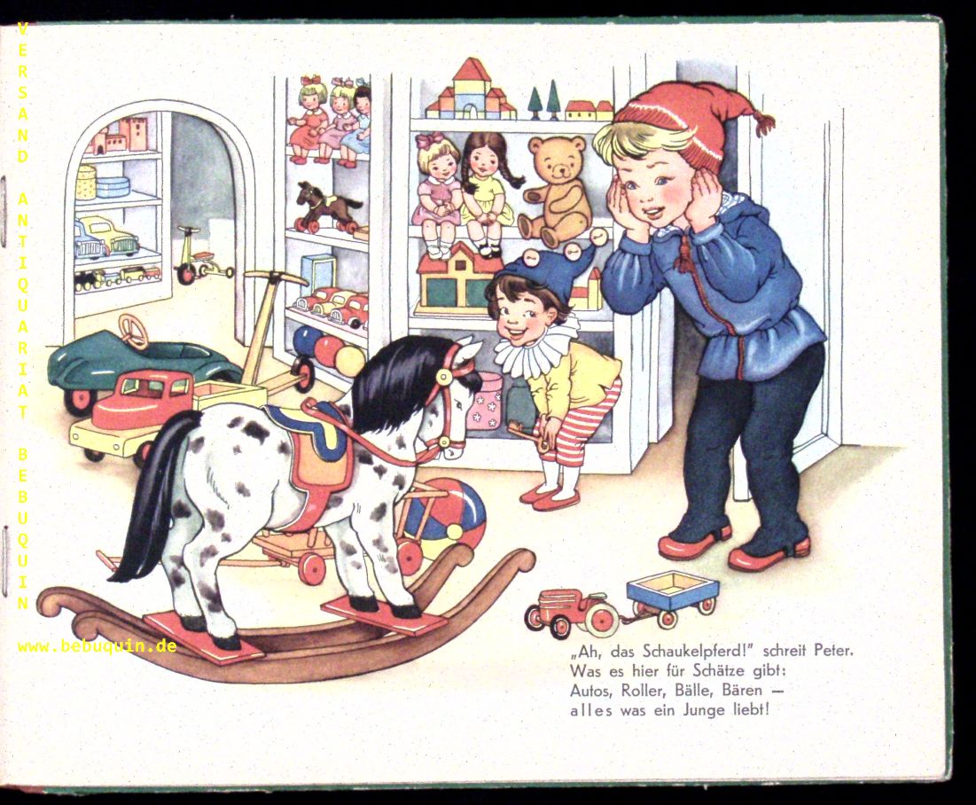 UMLAUF-LAMATSCH, Anneliese: Peterlein auf dem Weihnachtsmarkt. Ein Bilderbuch von Felicitas Kuhn. Fürth (Pestalozzi), 1965. Quer 4°. 8 Bl. mit farb. Bildern und farb. gestalteten Vorsatzpapieren. farb. ill. OHLn mit dem weiß gepunkteten Rücken. gutes Ex. = Verlagsnummer 69/1. Seltenes und gesuchtes Bilderbuch.