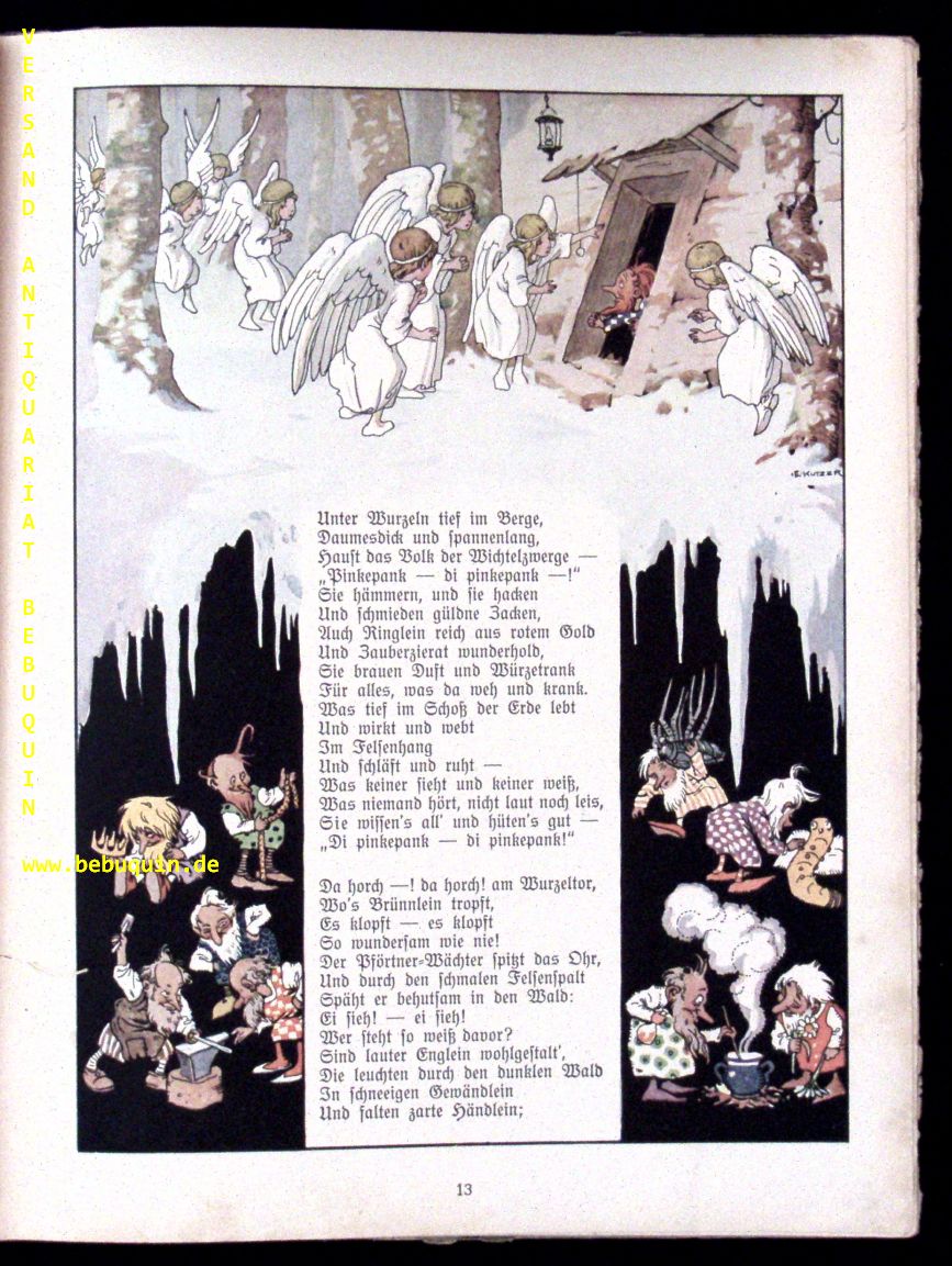 KUTZER.– HOLST, Adolf: Der Weihnachtsstern. Ein Wintermärchen. Leipzig (Hahn), (1921). Gr. 4°. 16 Bl. mit farb. Bildern von Ernst Kutzer. farb. ill. OHLn. Kanten berieben, etwas gelockert, sonst gut erhalten. EA. Als merkwürdiger Kontrast zur Welt der Engel, Wichtel- und Wassermänner, die das Buch bevölkern, erscheint die Großstadtszene mit dem (vergeblichen) Feilbieten am Weihnachtsabend. Kutzer Gedächtnis-Ausstellung Nr. 12. Blaume 81.