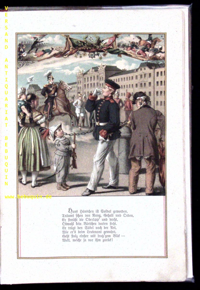 JÄDE, Heinrich: Hans Hänschen, das Etwas werden wollte. Ein Büchlein für kleine Kinder. 3.Aufl. Glogau (Flemming), (1880). 4°. 21 Bl. mit 20 farb. Bildern von Leopold Venus und Rudolf Geißler. farb. ill OHLn. kaum bestaubt und fingerspurig, gutes Ex. Vorstellung einiger Berufe. Wegehaupt 1697.