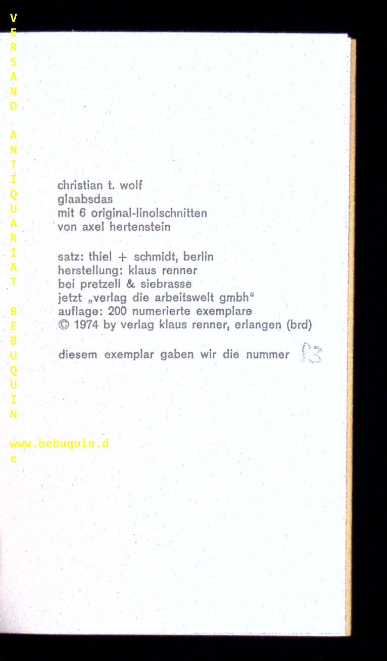 HERTENSTEIN.– WOLF, Christian T.: Glaabsdas. Bairischer Märchenzyklus. Erlangen (Renner), 1974. kl. 8°. 39 Bl. mit 6 Original Linolschnitten von Axel Hertenstein. OKart. tadellos. Nr. 83 von 200 numerierten Ex. der EA.