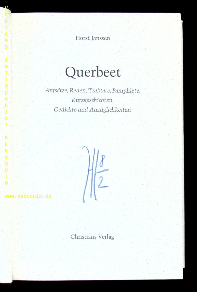 JANSSEN, Horst: Querbeet. Aufsätze, Reden, Traktate, Pamphlete, Kurzgeschichten, Gedichte u. Anzüglichkeiten. Hamburg (Christians), 1981. 436 S. OLn mit OUmschl. gutes Ex. EA mit dem eigenhändigen Monogramm des Autors in Blau auf Titelseite. Rüden A.69.1.2.