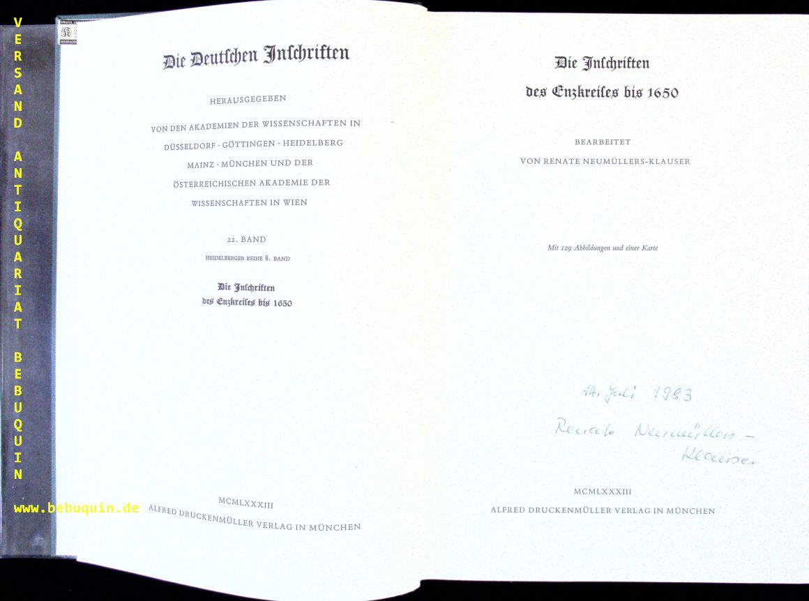 ENZKREIS.– NEUMÜLLERS-KLAUSER, Renate: (Bearb.) Die Inschriften des Enzkreises bis 1650. München (Druckenmüller), 1983. 4°. XXXII, 208, LVIII S. mit 118 Ill. auf Bildtafeln. OLn. mit Goldprägung. feines Ex. = Die deutschen Inschriften, Bd. 22 : Heidelberger Reihe, Bd. 8. EA mit der eigenhändigen datierten Signatur der Verfasserin auf Titelseite.