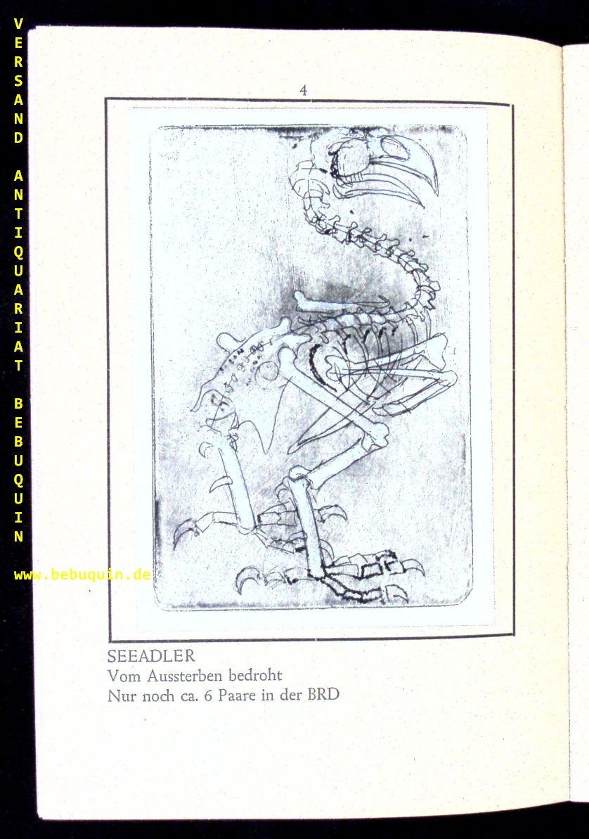 VOGL, Hubert: Sehr unvollständige illustrierte Rote Liste der in Mitteleuropa oder in der Bundesrepublik Deutschland gefährdeten oder vom Aussterben bedrohten Tiere. Mit einem Nachruf. Schwabach (Vogl), 1978. Oktav. 14 Bl. mit 12 mont. radierungen von Hubert Vogl. OKart. feines Ex. = Schwabacher Drucke, 16. Nr. 124 von 500 Ex. dieser EA.