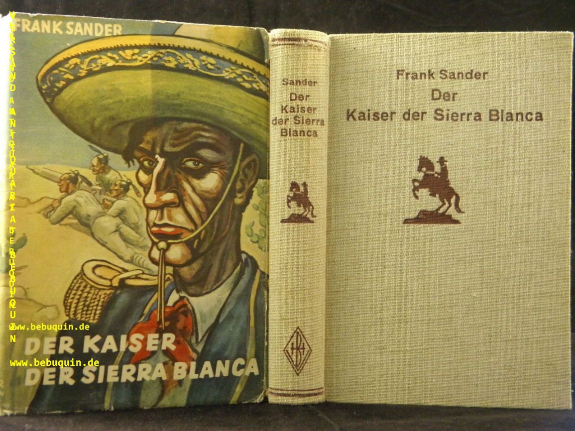 SANDER, Frank: Der Kaiser der Sierra Blanca. Bremen (Burmester), 1935. 224 S. ill. OLn. mit OUmschl. Umschlag kaum gebräunt, feines Ex. = Burmester’s Abenteuer – Serie. seltene EA. Frank Sander hieß in Wirklichkeit Otto Neitsch und war Berliner Senator. Geboren 1892 in Eckernförde, Vater dreier Söhne und gestorben 1941 in Berlin.
