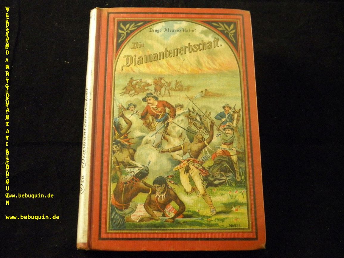 ALVAREZ-HALM, Diego: Die Diamentenerbschaft. Eine Erzählung für dei Jugend. Neu-Ruppin (Kühn), (1904). 96 (1) S. mit 4 Chromolithos farb. ill. OHLn. Einband foliert, Innendeckel überklebt, im Block leicht gelockert, insgesamt gutes Ex. seltene EA. Klotz 83/3.