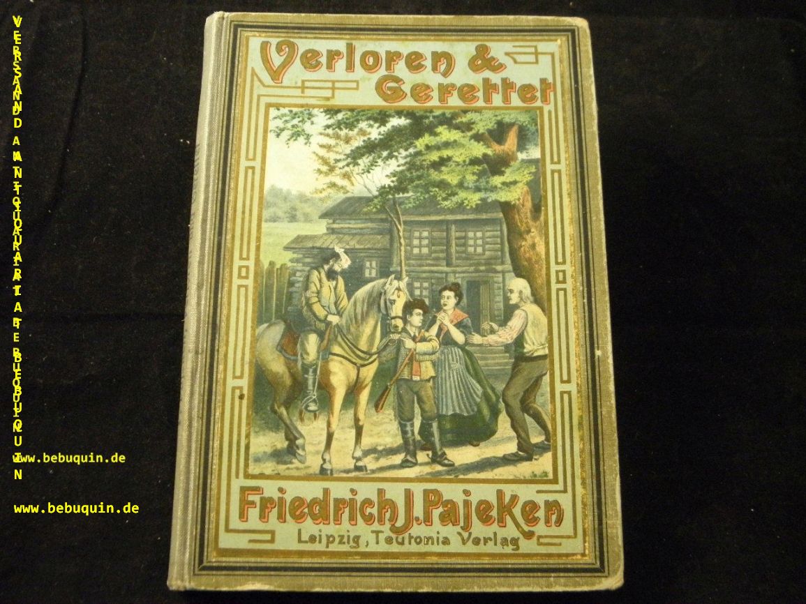 PAJEKEN, Friedrich J.: Verloren und gerettet. Eine Erzählunge aus dem wilden Westen Nordamerikas. Leipzig (Teutonia), 1908. 80 S. + 4 Farbendruckbildern. farb. ill. OHLn. fliegender Vorsatz fehlt, sonst gutes Ex. recht seltene EA Klotz 5284/28.