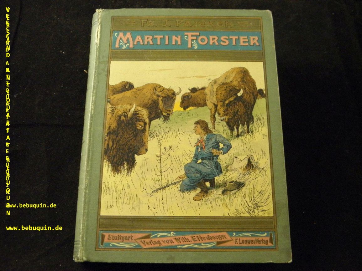 PAJEKEN, Friedrich J.: Martin Forster. Erlebnisse eines Knaben im wilden Westen. Stuttgart (Effenberger), (1898). 3 Bl., 146 (6) S. mit 4 Farbendruckbildern von A. Richter. farb. ill. OLn. Kanten berieben, WaV. seltene EA. Klotz 5284/14.