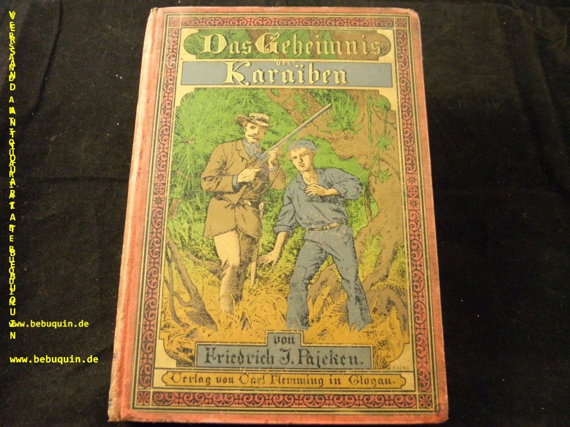 PAJEKEN, Friedrich J.: Das Geheimnis des Karaiben. Eine Erzählung aus den Tropen Südamerikas für die reifere Jugend. Glogau (Flemming), (1891). Gr. 8°. V, 185 S. mit 8 Holzschnitten von Joh. Gehrts. farb. ill. OLn. Einband etwas gebräunt und berieben, Vorsätze stabilisiert, insgesamt noch gut. seltene EA. Klotz 5284/8. Friedrich Joachim Pajeken (Bremen 1855 – 1920) war Kaufmann und Verfasser von Abenteuerromanen für Jugendliche. „1876 wurde er als Kaufmann nach Ciudad Bolívar am Orinoko geschickt, wo er in den nächsten drei Jahren Erfahrungen im Überseehandel sammelte. Seinen dortigen Aufenthalt nutzte er für zahlreiche Streifzüge durch das Land. Nebenbei befasste er sich eingehend mit den in Bolivien lebenden Indianern. Um auch die nordamerikanischen Indianer kennenzulernen, begab er sich für zwei Jahre auf die ‚Hollers Ranch‘ am Brod River in den Bighorn Mountains und knüpfte gute Kontakte zu den dort lebenden Indianern. Von diesen erhielt er aufgrund seiner etwas gelblichen Hautfarbe und seiner Leistungen als guter Jäger den Ehrennamen ’Yellow Eagle.“ (wikipedia).–