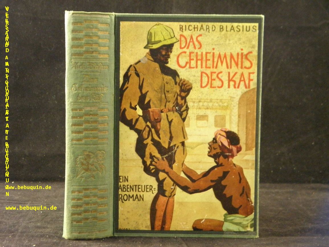 BLASIUS, Richard: Das Geheimnis des Kâf. Abenteuer-Roman. Stuttgart (Weise), (1929). 381 (2) S. mit 1 Titelbild. farb. ill. OLn. vorderes Gelenk gelockert. EA Klotz 521/4.