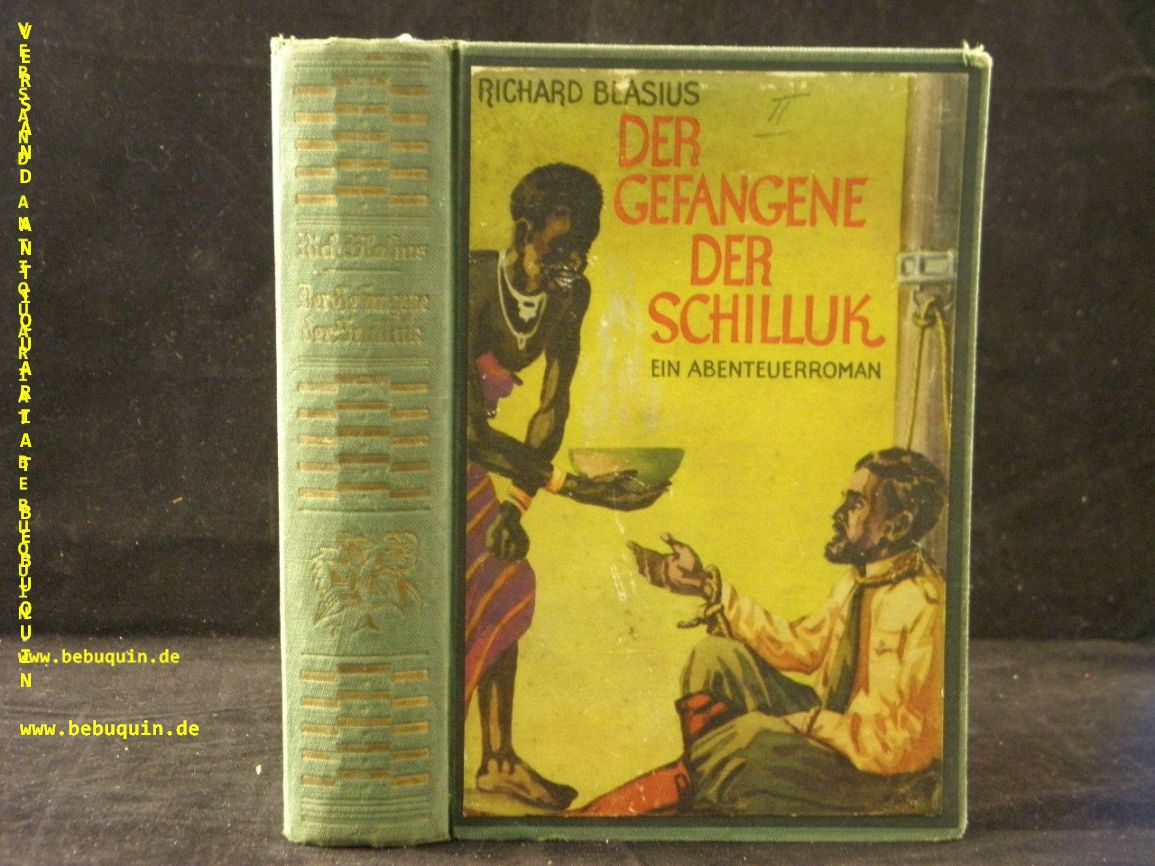 BLASIUS, Richard: Der Gefangene der Schilluk. Abenteuer-Roman Leipzig (Weise), (1929) 372 (2) S. farb. ill. OLn. mit OUmschl. Umschlagkanten hinterlegt, leicht gebräunt. EA. Klotz 521/3.