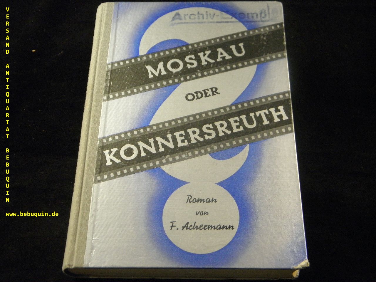 ACHERMANN, F.H.: Moskau oder Konnersreuth? Baden (Buchdruckerei), 1935. 304 S. ill. OHLn. Archivstempel auf Einband, Vorsatz und Titelseite. EA des antibolschewistischen Titels des als Schweizer Karl May bezeichneten Schriftstellers.