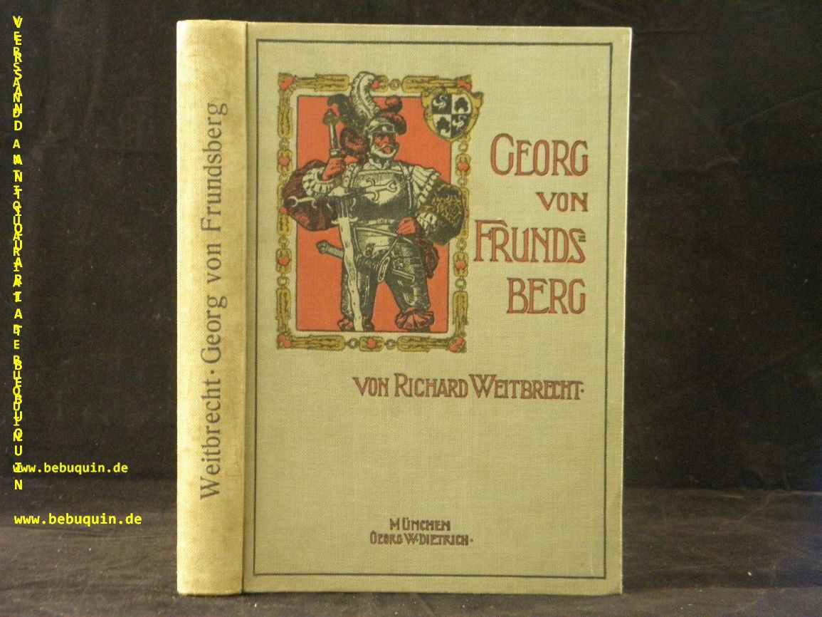 WEITBRECHT, Richard: Georg von Frundsberg. Eine Landsknechtgeschichte. Der Leutfresser und sein Bub. 2. Auflage. München (Dietrich), (1910). Gr. 8°. 266 (12) S. mit 8 Abb. von Anton Hoffmann. ill. OLn. NaT, eine Ecke leicht bestoßen, gutes Ex. 1. Aufl. dieser Ausgabe. Klotz 8076/7.