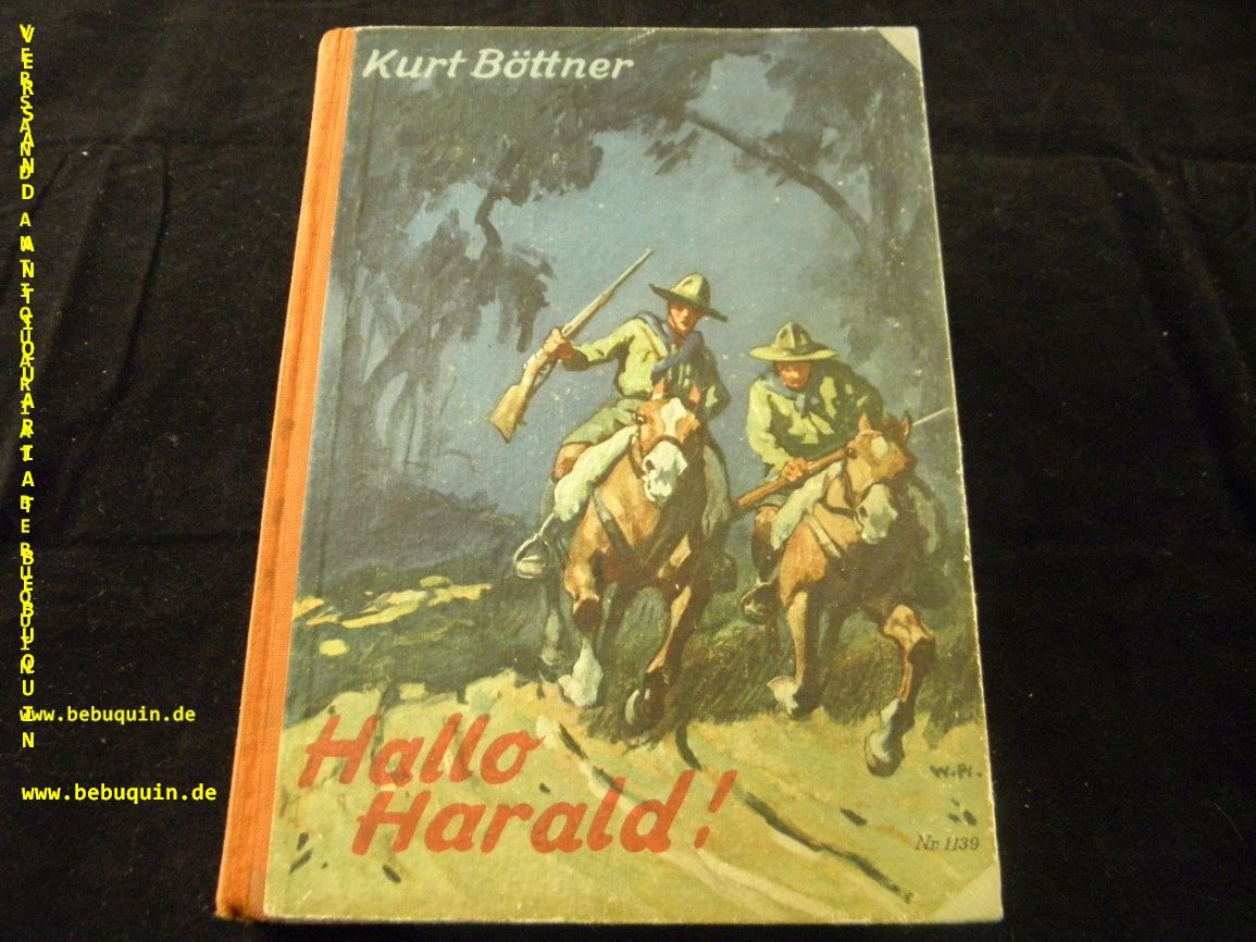 BÖTTNER, Kurt: Hallo – Harald! Erlebnisse ud Abenteuer deutscher Kolonistenjungen in Südamerika. Stuttgart (Loewe), ca 1930. Gr. 8°. 182 (2) S. mit 6 Farbendruckbildern und 8 Schwarzbildern von Willy Planck. farb. ill. OHLn. StaT. EA.