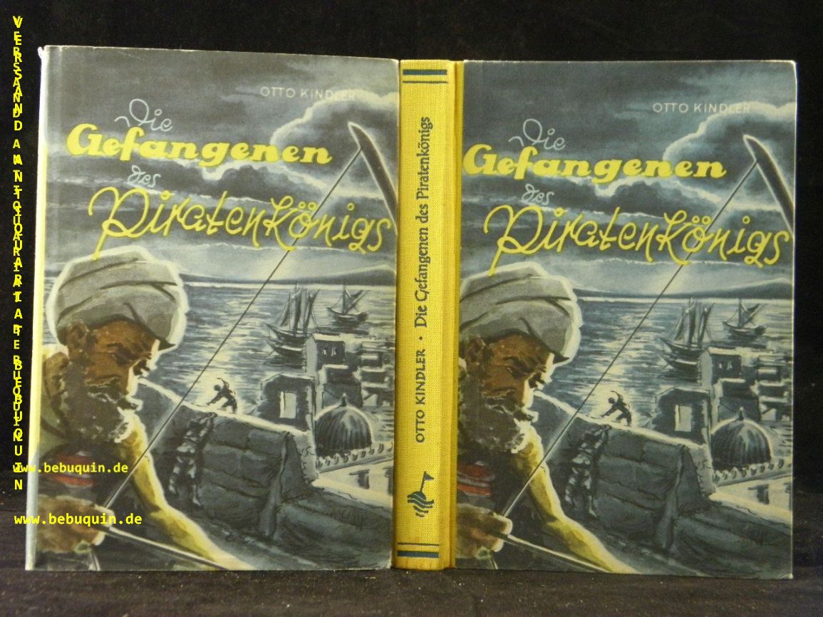 KINDLER, Otto: Die Gefangenen des Piratenkönigs. Eine Erzählung aus derZeit der algerischen Seeräuber. Stuttgart (Boje), 1951. 152 (4) S. mit zahlr. Illustrationen farb. ill. OHLn. mit OUmschl. feines Ex. = Freymuth – Serie, Bd. 1. EA. Klotz 3386/1.