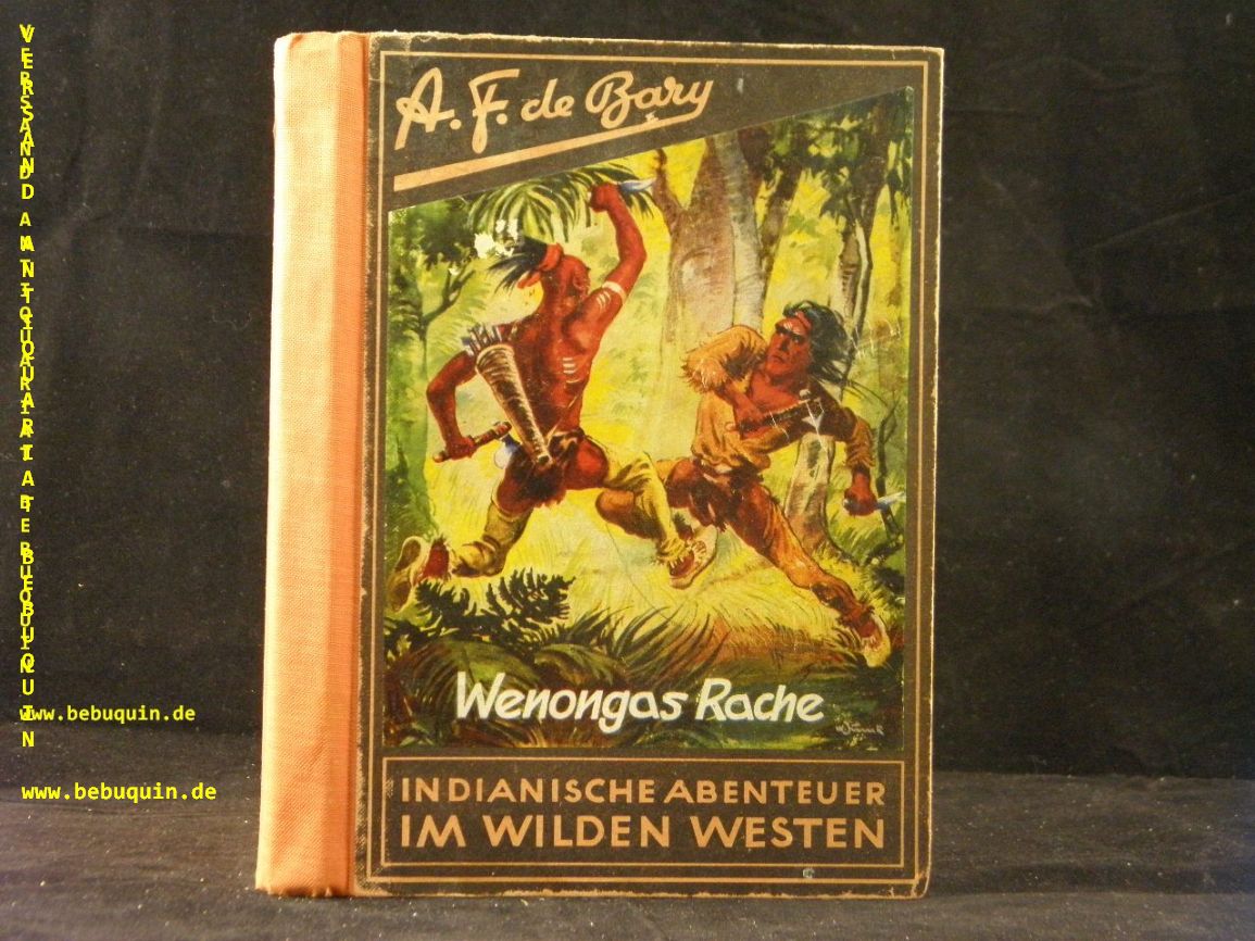 BARY, A.F. de: Wenongas Rache. Indianische Abenteuer im Wilden Westen. Enthält: Inhalt die Bluträcher von Quebec, Fort am Ontario, Skalpjäger am Niagara,auf der Spur der Bluträcher, Mörder und Verräter, La Salle hält Gericht, Wanongas Rache, rote Götter – weiße Banditen. Frankfurt (Buch-Union), 1950. Gr. 8°. 256 S. farb. ill. OHLn. gutes Ex. EA dieser seltenen Heftreihe.