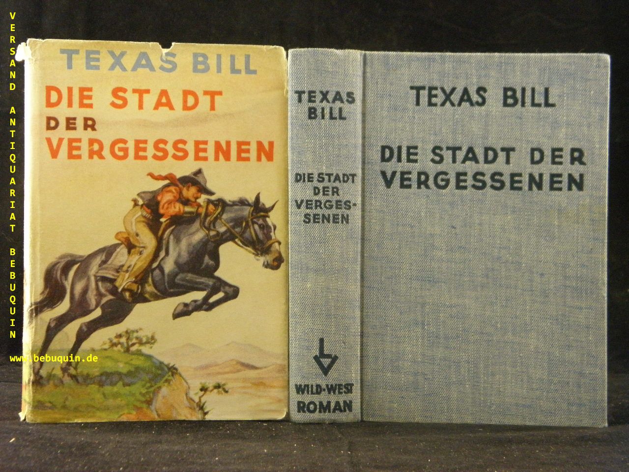 TEXAS BILL.– SCHUBERT, P.H.: Die Stadt der Vergessenen. Wild-West-Roman. Leipzig (Lipsia), 1938. 280 S. OLn. mit OUmschl. Umschlag mit leichten Randläsuren, sehr schönes Ex. seltene EA.