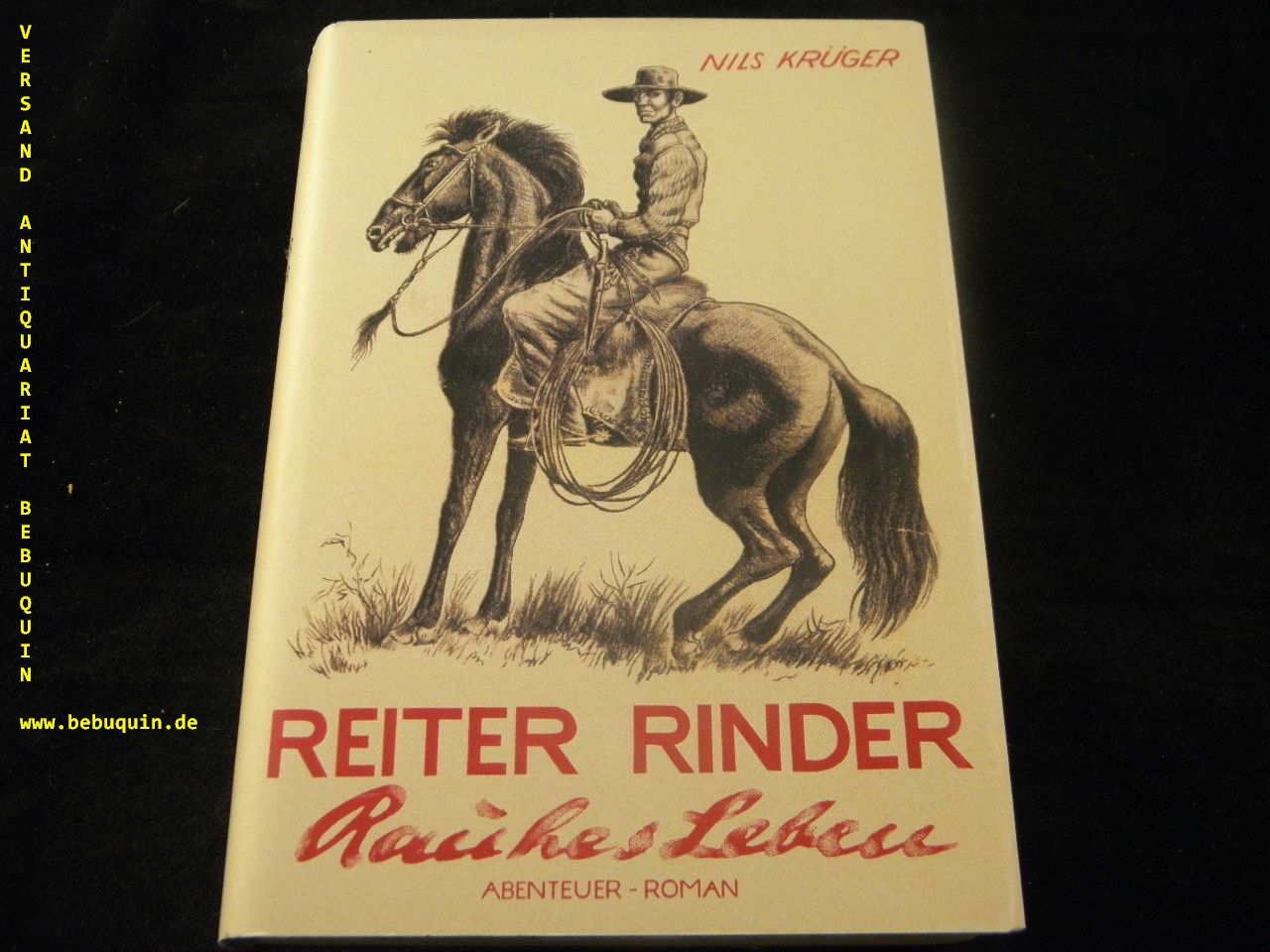 KRÜGER, Nils: Reiter – Rinder Rauhes Leben. Abenteuer-Roman. Leipzig (Dietsch), 1941. 287 S. grünblaues OHLn. mit neuem Umschl. kaum gelockert. = Bücher de Spannung. seltene EA.