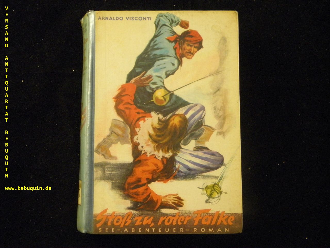 VISCONTI, Arnaldo: Stoß zu, „Roter Falke“. Seeabenteuer-Roman. Hamburg (Petersen), (1953). 272 S. farb. ill. OHLn. gestempeltes Leihbuch. EA.