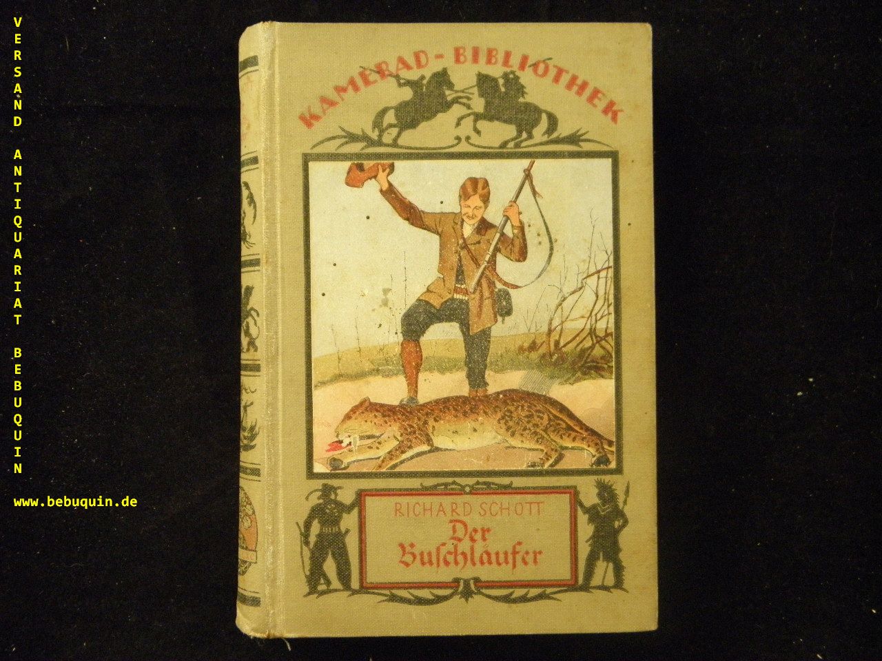 KAMERAD-BIBLIOTHEK.– SCHOTT, Richard: Der Buschläufer. 26. Aufl. Stuttgart (Union), ca 1922. kl. 8°. 335 S. mit zahlr. Bildern + Werbeanhang. farb. ill. OLn. Rücken gering fleckig, NaV. = Bd. 13. Klotz 6542/2.