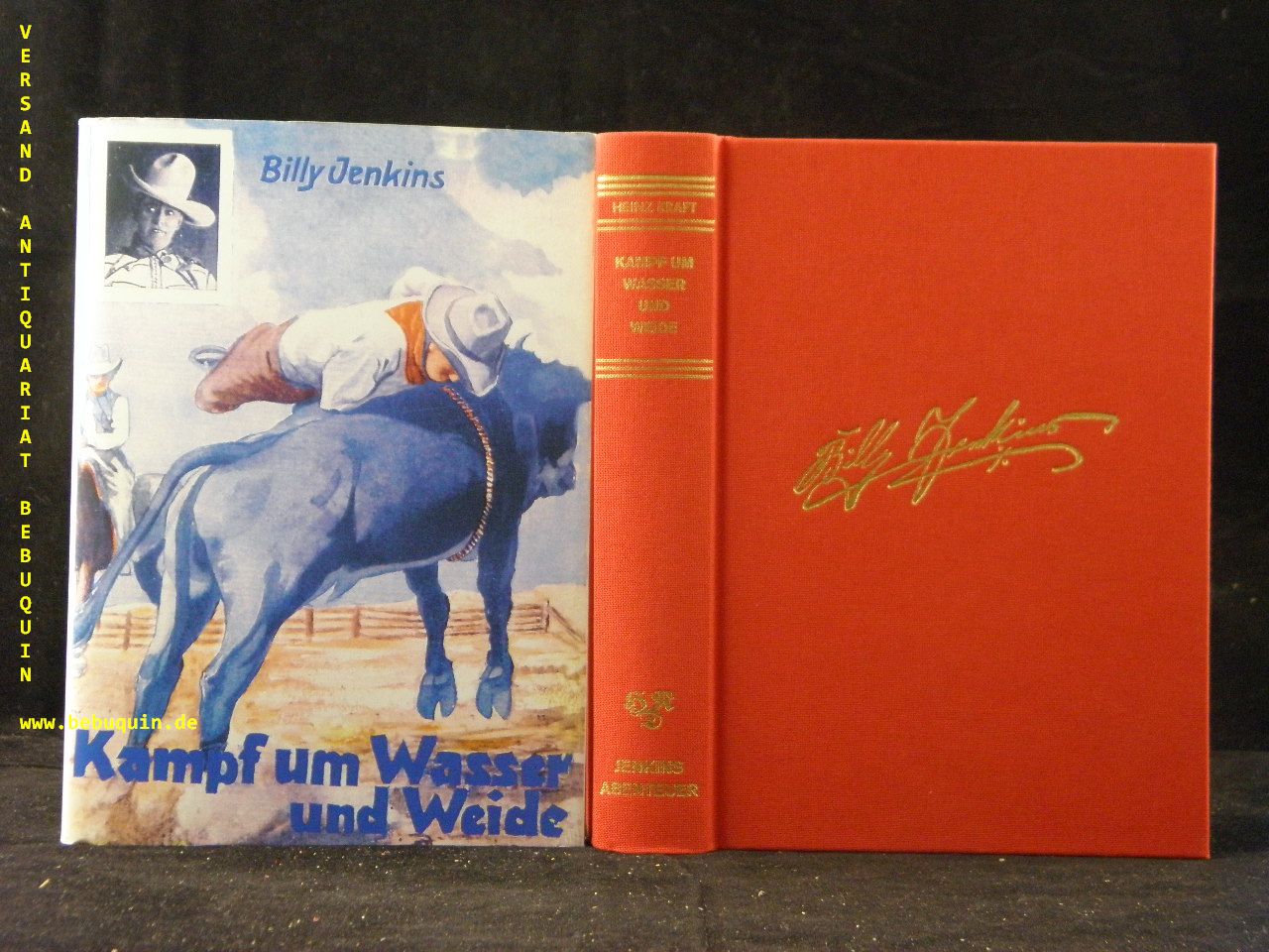 BILLY JENKINS.– KRAFFT, Heinz: Kampf um Wasser und Weide. Nach den Berichten und Aufzeichnungen von Billy Jenkins. Reprint derAusgabe: Leipzig (Dietsch), 1935. 288 S. rotes OLn mit goldgeprägter Signatur und OUmschl. neuwertig. = Bücher der Spannung, Nr. 7. sehr seltener Reprint des im Original unauffindbaren Titels.