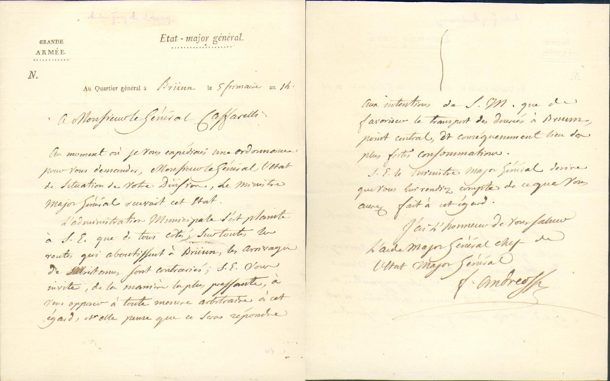 ANDREOSSY, Antoine Francois (Castelnaudary 1761 – Montauban 1828). General der Artillerie 1797 (bestätigt 1798): Eigenhändiger Brief mit Unterschrift als Stabschef der Armee und Stellvertreter des Major-Generals Marschall Berthier an General CAFFARELLI. Brünn, 26.11.1805. 22 x 18 cm. 2 S. auf Doppelbogen mit dem gedruckten Kopf der „Grande Armée“ und dem Wasserzeichen eines auf einer Kugel stehenden Menschen. mittig gefaltet. Verfasser war Comte de l’Empire 1809. Armée d’Italie 1794, in Arcole, Armée d’Angleterre 1798, Armée d’Orient 1798, Stabschef von Bonaparte am 18. Brumaire, Generaldirektor des Depot de la Guerre 1802, Botschafter in England 1803, Grande Armée 1805, Gesandter in Wien 1806, Gouverneur von Wien 1809, Botschafter in Konstantinopel 1812.