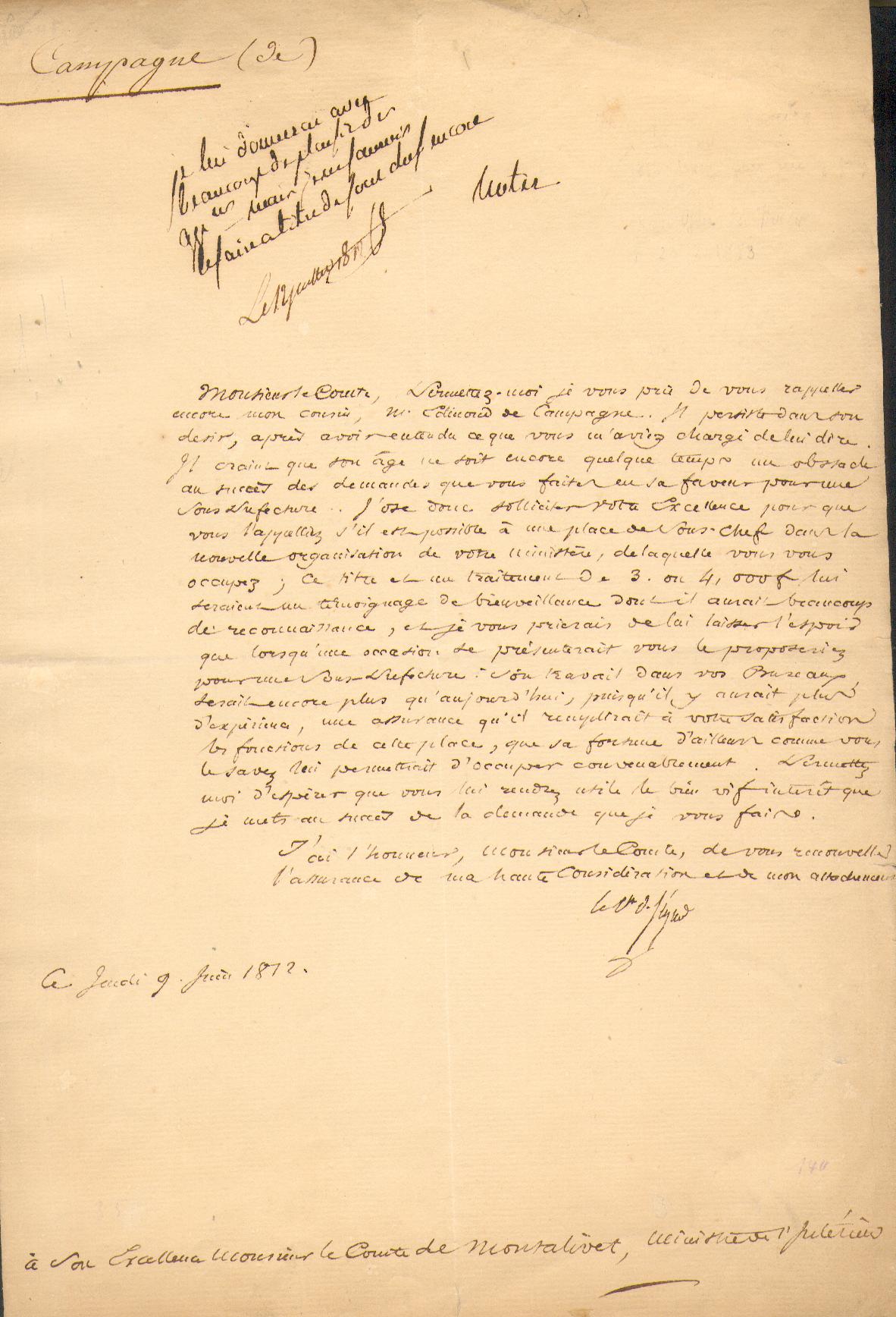 SÉGUR D’AGUESSEAU, Louis Philippe de (Paris 1753 – Paris 1830). General 1791: Brief mit Unterschrift an den Innenminister Comte de MONTALIVET. (Paris), 9.6.1812. 31 x 20 cm. Doppelbogen Hadernbütten mit schönem figürlichem Wasserzeichen. an den Rändern gebräunt, mittig gefaltet. Verfasser war Comte de l’Empire 1808. Botschafter in Rußland 1784-1789, in Rom 1791, der Papst weigerte sich, ihn zu empfangen; schwer verwundet in einem Duell 1792, Deputierter 1801, Mitglied des Instituts 1803, Senator 1813.