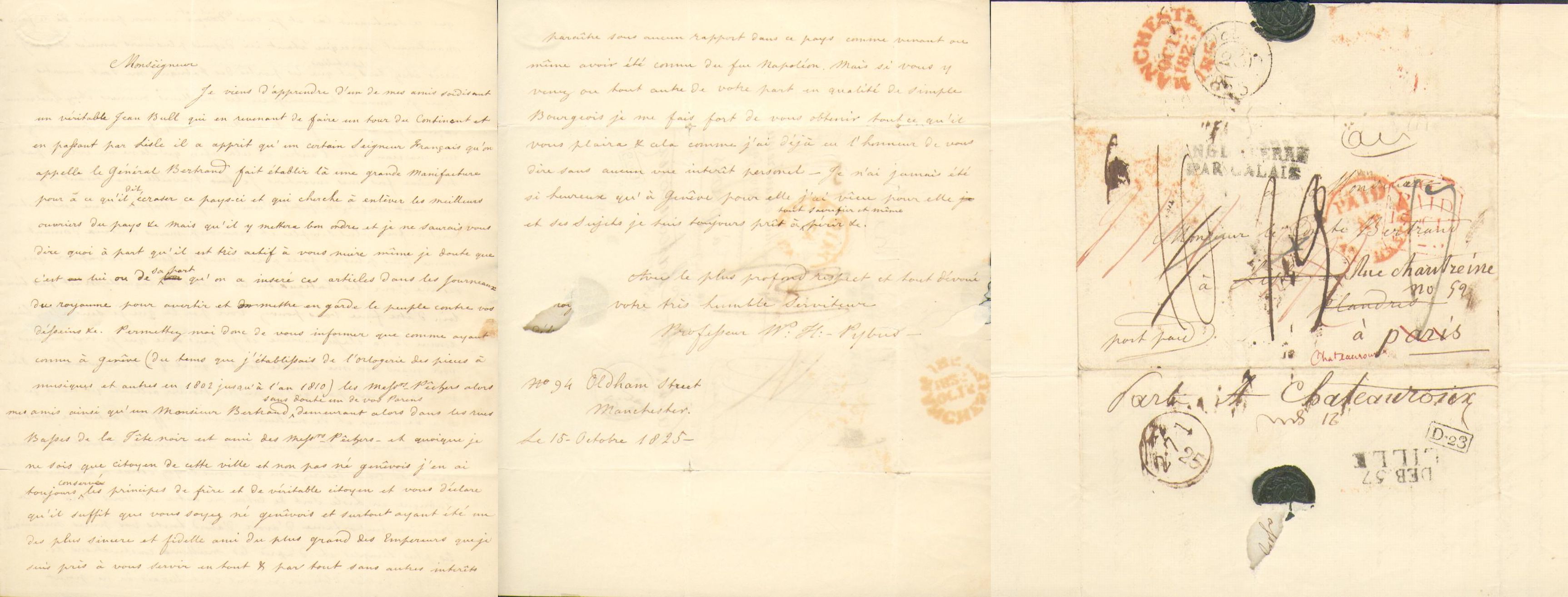 BERTRAND.– PYBUS, W. H., Professor für Mechanik in Manchester (England): Eigenhändiger Brief mit Unterschrift an den Comte BERTRAND in CHATEAUROUX. MANCHESTER, 15.10.1825. 22 x 19 cm. 4 Seiten auf Hadernbütten mit Wasserzeichen mit schwarzem Lacksiegel und diversen postalischen Vermerken und Stempeln und Blindstempel. gute Erhaltung. Der Text ist etwas schwer verständlich, in einem seltsamen Französisch. Offenbar handelt es sich bei dem Adressaten um den General Comte BERTRAND, einem der treuesten Freunde Napoleons, dem er helfen möchte. Pybus hatte einige Jahre in Genf gelebt und dort eine Uhrmacherei besessen.