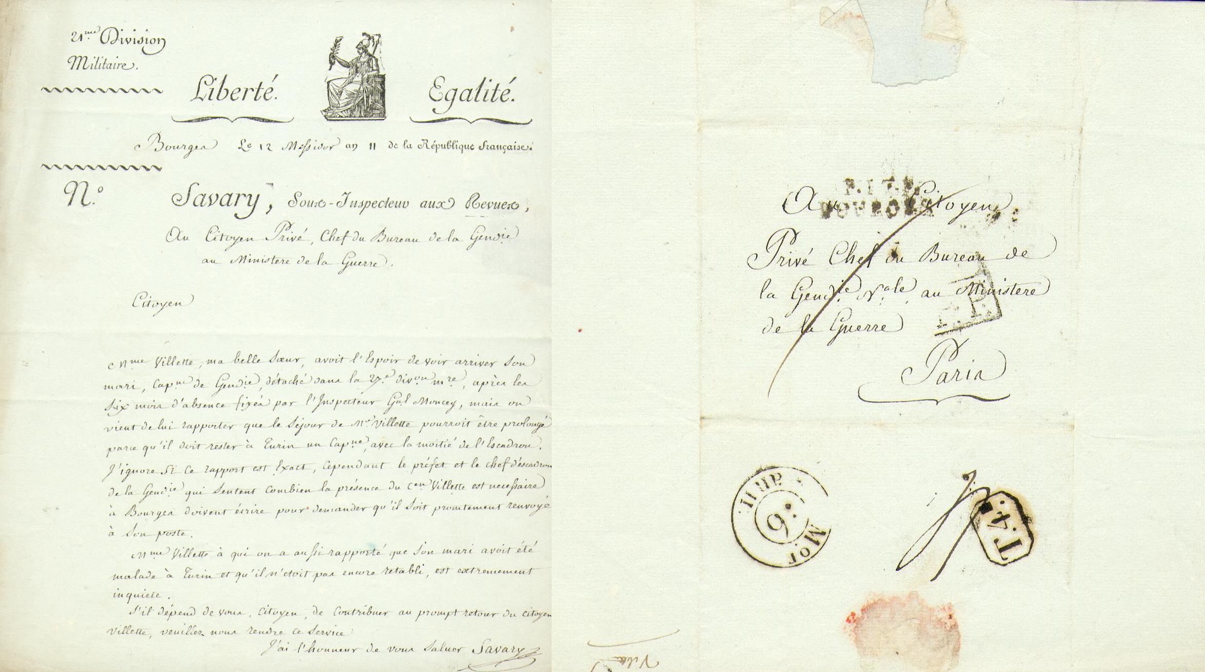 SAVARY, Jean-Julien-Marie (1753 – 1839), Gerichtspräsident von Cholet: Eigenhändiger Brief mit Unterschrift als Unter-Inspektor für die Musterungen (Sous-Inspecteur aux revues) an PRIVÉ, Bürochef der Gendarmerie beim Kriegsministerium in Paris. Bourges, 1. Juli 1803. 22 x 18 cm. 2 S. Hadernbütten Doppelbogen mit Kopfdruck, Vignette und Siegelresten auf der Adressseite. Postalisch mit diversen Stempeln und Bearbeitungsvermerken gelaufen. Am Siegel etwas lädiert, gut erhalten. Verfasser war ein Anwalt, der die Prinzipien der Revolution annahm. 1790-1793 Präsident des Strafgerichtshofs von Cholet. Beim Aufstand der Vendée von den Rebellen gefangen genommen, konnte aber entkommen. Zivilkommissar beim Stab der Generale Canclaux und Kleber, nahm an der Schlacht von Saveny teil. Mitglied des Rats der 500 und dem Conseil des Anciens, während dem Konsulat und in der Kaiserzeit zunächst Unter-Inspektor dann 1812 Inspektor für die Musterungen. Verfasser historischer Schriften, darunter ein Werk über den Krieg in der Vendée.