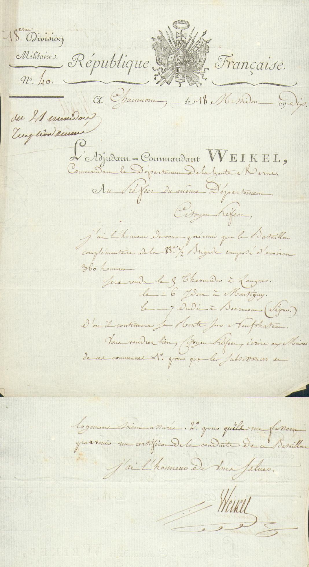 WEIKEL, Eigenhändiger Brief mit Unterschrift als Militärkommandant des Departeme