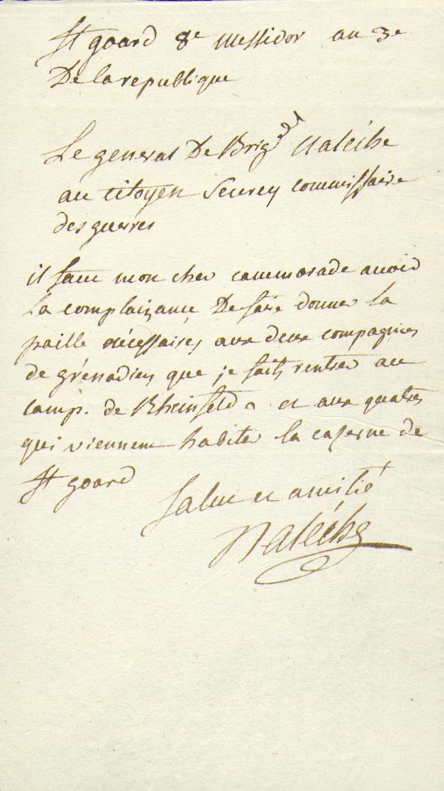 ST. GOAR.– NALÈCHE, Gilbert Jacques Brandy de (Felletin 1756 – Felletin 1820). General 1793 (bestätigt 1795): Eigenhändiger Brief mit Unterschrift an den Kriegskommissar Surey. Es geht um Strohlieferungen für die Pferde der Rheinarmee. St. Goar, 26.6.1795. 19 x 10 cm. 1 S. Hadernbütten. gut erhalten. Verfasser war bei der Armée des Ardennes 1793, in der Schlacht von Fleurus, eroberte mit Marceau Koblenz am 24. Oktober 1794, Armée de Sambre-et-Meuse 1795, zog sich 1797 aufgrund seiner Verwundungen aus dem aktiven Dienst zurück, 1809 reaktiviert für die Armée de Brabant.