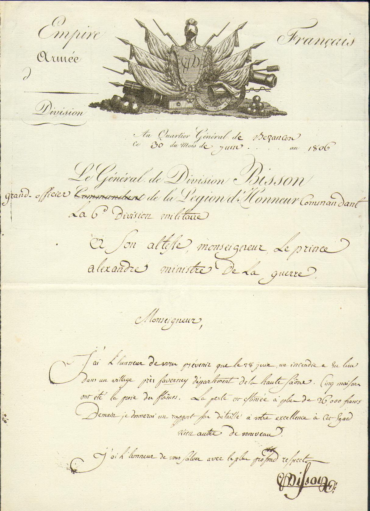 BISSON, Baptiste Pierre Francois Jean Gaspard (Montpellier 1767 – Marmiruolo/Italien 1811). General 1800: Brief mit Unterschrift als Kommandant der 6. Militärdivision an den Kriegsminister Marschall Berthier. Im Hauptquartier von BESANCON, 13.6.1806. 29 x 20 cm. 1 S. Hadernbütten mit sehr schöner Vignette. TOP Erhaltung. Der Comte de l’Empire 1808. Armée des Ardennes 1792, de Sambre et Meuse 1794, in Italien 1797, zeichnete sich in der Schlacht von Marengo aus, Armée des Côtes de l’Océan 1803, Grande Armee 1805, in der Schlacht von Friedland 1807, in Italien, Gouverneur des Friaul 1809, war fettleibig und erhielt einen Soldzuschuss um seinen Appetit und seinen Alkoholgenuss zu befriedigen (!).