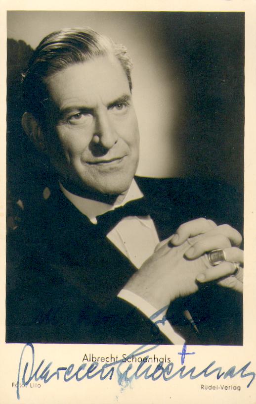 SCHÖNHALS, Albrecht: eigenhändige Unterschrift auf Rüdel – AK. Rückseitig 14-zeiliger handschriftlicher eigenhändiger Text des Schauspielers und Arztes vom 5.11.1959 über Fernsehprojekte. Hamburg (Rüdel), 1959. Ungelaufen. S/W. Unterschrift leicht verwischt.